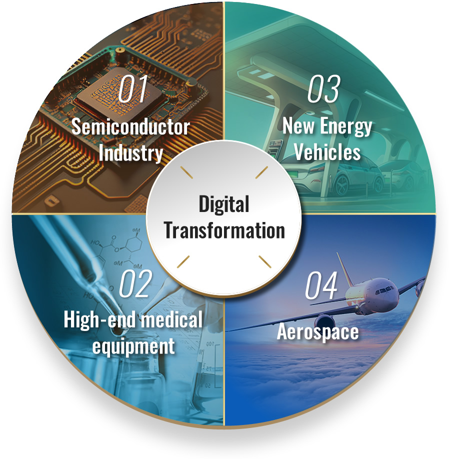 - With a focus on digital transformation, we are committed to cultivating industries such as semiconductors, high-end medical devices, new energy vehicles, and aerospace. We assist SMEs in their journey toward digital transformation, including cloud architecture, AI models, and digital databases.